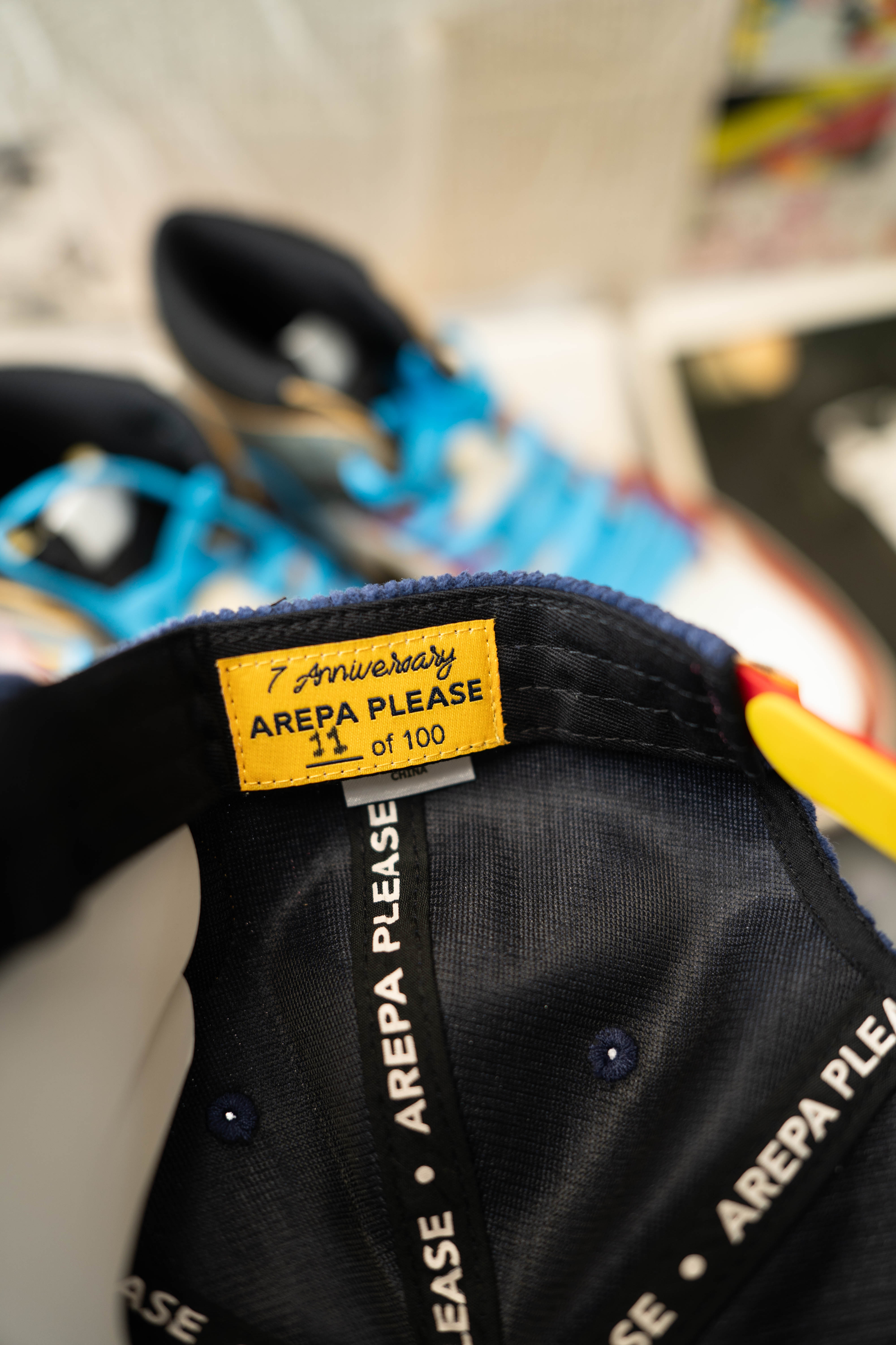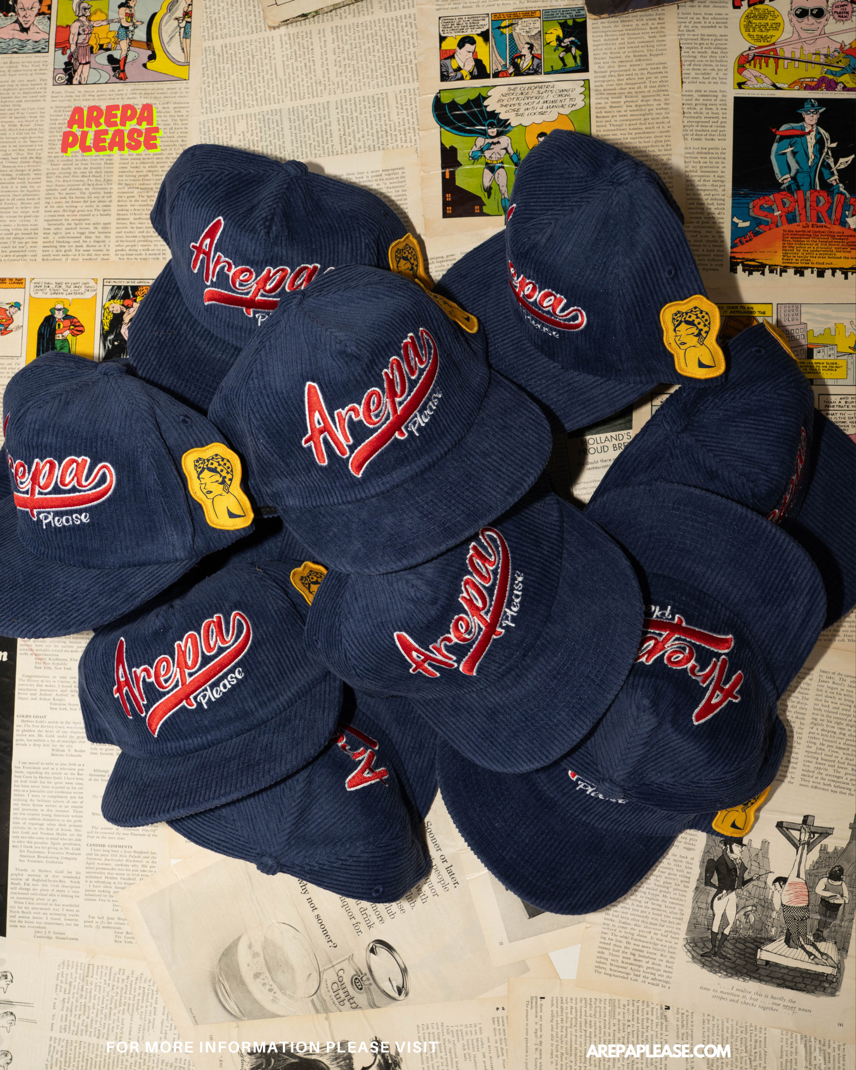 To celebrate our anniversary, we made something special — a navy corduroy hat featuring the Arepa Lady badge and Arepa Please embroidery. Only 100 made. Each one numbered. No restocks.